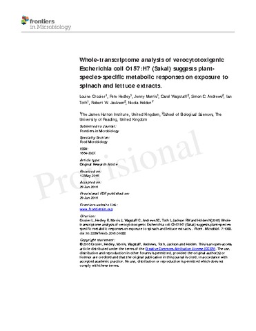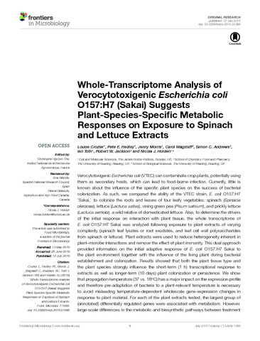 Verocytotoxigenic Escherichia coli (VTEC) can contaminate crop plants, potentially using them as secondary hosts, which can lead to food-borne infection. Currently, little is known about the influence of the specific plant species on the success of bacterial colonisation. As such, we compared the ability of the VTEC strain, E. coli O157:H7 ‘Sakai’, to colonise the roots and leaves of four leafy vegetables: spinach (Spinacia oleracea), lettuce (Lactuca sativa), vining green pea (Pisum sativum) and prickly lettuce (L. serriola), a wild relative of domesticated lettuce. Also, to determine the drivers of the initial response on interaction with plant tissue, the whole transcriptome of E. coli O157:H7 Sakai was analysed following exposure to plant extracts of varying complexity (spinach leaf lysates or root exudates, and leaf cell wall polysaccharides from spinach or lettuce). Plant extracts were used to reduce heterogeneity inherent in plant-microbe interactions and remove the effect of plant immunity. This dual approach provided information on the initial adaptive response of E. coli O157:H7 Sakai to the plant environment together with the influence of the living plant during bacterial establishment and colonisation. Results showed that both the plant tissue type and the plant species strongly influence the short-term (1 hour) transcriptional response to extracts as well as longer-term (10 days) plant colonisation or persistence. We show that propagation temperature (37 versus 18 oC) has a major impact on the expression profile and therefore preadaptation of bacteria to a plant-relevant temperature is necessary to avoid misleading temperature-dependent wholescale gene-expression changes in response to plant material. For each of the plant extracts tested, the largest group of (annotated) differentially regulated genes were associated with metabolism. However, large-scale differences in the metabolic and biosynthetic pathways between treatment types indicate specificity in substrate utilisation. Induction of stress-response genes reflected the apparent physiological status of the bacterial genes in each extract, as a result of glutamate-dependent acid resistance, nutrient stress or translational stalling. A large proportion of differentially regulated genes are uncharacterised (annotated as hypothetical), which could indicate yet to be described functional roles associated with plant interaction for E. coli O157:H7 Sakai.