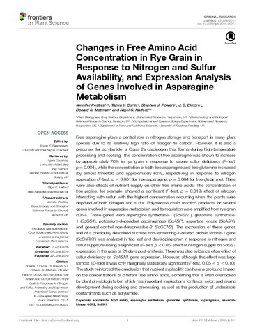 Postles, J., Curtis, T. Y., Powers, S. J., Elmore, J. S. orcid id iconORCID: https://orcid.org/0000-0002-2685-1773, Mottram, D. S. and Halford, N. G. (2016) Changes in free amino acid concentration in rye grain in response to nitrogen and sulfur availability, and expression analysis of genes involved in asparagine metabolism. Frontiers in Plant Science, 7. 917. ISSN 1664-462X doi: 10.3389/fpls.2016.00917