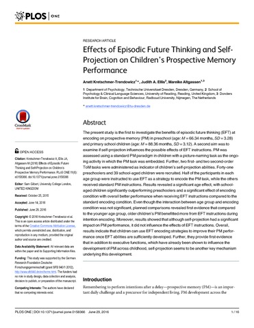 Kretschmer-Trendowiez, A., Ellis, J. and Altgassen, M. (2016) Effects of episodic future thinking and self-projection on children’s prospective memory performance. PLoS ONE, 11 (6). e0158366. ISSN 1932-6203 doi: 10.1371/journal.pone.0158366