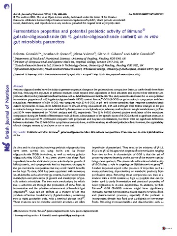 Grimaldi, R., Swann, J. R., Vulevic, J., Gibson, G. R. orcid id iconORCID: https://orcid.org/0000-0002-0566-0476 and Costabile, A. (2016) Fermentation properties and potential prebiotic activity of Bimuno® galacto-oligosaccharide (65 % galacto-oligosaccharide content) on in vitro gut microbiota parameters. British Journal of Nutrition, 116 (3). pp. 480-486. ISSN 0007-1145 doi: 10.1017/S0007114516002269