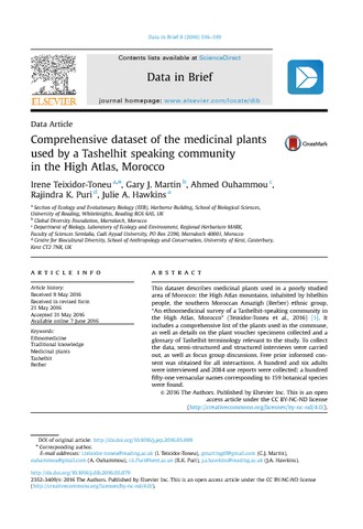 This dataset describes medicinal plants used in a poorly studied area of Morocco: the High Atlas mountains, inhabited by Ishelhin people, the southern Moroccan Amazigh (Berber) ethnicgroup, “An ethnomedicinal survey of a Tashelhit-speaking community in the High Atlas, Morocco” (Teixidor-Toneuetal.,2016). It includes a comprehensive list of the plants used in the commune, as well as details on the plant voucher specimens collected and a glossary of Tashelhit terminology relevant to the study. To collect the data, semi-structured and structured interviews were carried out, as well as focus group discussions. Free prior informed consent was obtained for all interactions. A hundred and six adults were interviewed and 2084 use reports were collected; a hundred fifty-one vernacular names corresponding to 159 botanical species were found.