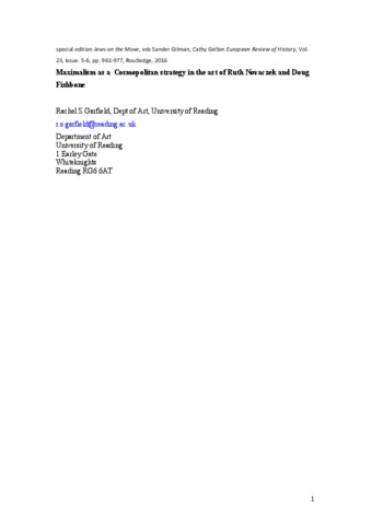Ruth Novaczek and Doug Fishbone: Cosmpolitanism, Jewishness and Art This paper looks at the work of the experimental film-maker Ruth Novaczek and the artist Doug Fishbone to think through the relationship between the cosmopolitan imagination, Jewishness and the visual arts. I suggest through my analysis of their art work that both artists proffer a cosmopolitan subject that arises out of their Jewish subjectivity. I will do this in different ways, discussing the art- works both in their various forms as well as the subject matter within the films. I will think through two recent publications on the cosmopolitan and art by Marsha Merskimmon and Nikos Papastergiadis to discuss what is at stake in the cosmopolitan in relation to the two artist case studies. Central to my argument is a maximalist tendency that goes against the usual current paradigmatic trend of the “long look” that was first articulated by the influential André Bazin as more real than the dialectical editing techniques argued (and performed) by Sergei Eisenstein. But neither am I arguing for a return to Eisenstein. Maximalism, as offered by the work of these artists signifies an excessive overloading that allows the viewer to insert themselves into the narrative of the work through the editing, the collage, and in the density of the range of the material. Finally, I will be bringing the formal discussion into dialogue with the explicit meaning developed by the art-work. Each of these artists proffer an unstable subject that is profoundly formed out of their Jewish and Diasporic subjectivity. This arises not just out of the formal structural scaffolding of the work but in terms of the subject matter within the work. They both explicitly use Jewish cultural references as a normative navigational tools in the work and as a way of forming their cultural worlds. These references range from dialogues of Jewish characters in cinema, to Jewish jokes and use of Yiddish or Hebrew. Importantly Jewish religion or ritual is absent. For both of these artists the Holocaust is a backdrop but not as way to valorize a victim status but as a way to reach out to a wider humanity and to understand its legacies. This is done through multi-positionality and the questioning of what a ‘home’ might be outside of an attachment to a nation state or a singular geographic location and embracing that estrangement. In sum, I will argue that the work offers a reiterative provisionality as a refusal to judge or to know the world; instead there is an attempt to incorporate its complexities and range into the vision of the work, challenging the viewer to identify what is at stake in the work and in the subject.