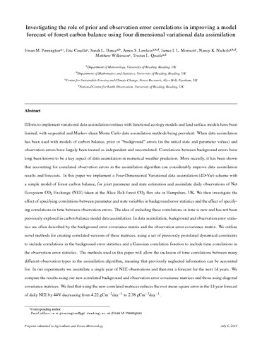 Efforts to implement variational data assimilation routines with functional ecology models and land surface models have been limited, with sequential and Markov chain Monte Carlo data assimilation methods being prevalent. When data assimilation has been used with models of carbon balance, prior or “background” errors (in the initial state and parameter values) and observation errors have largely been treated as independent and uncorrelated. Correlations between background errors have long been known to be a key aspect of data assimilation in numerical weather prediction. More recently, it has been shown that accounting for correlated observation errors in the assimilation algorithm can considerably improve data assimilation results and forecasts. In this paper we implement a Four-Dimensional Variational data assimilation (4D-Var) scheme with a simple model of forest carbon balance, for joint parameter and state estimation and assimilate daily observations of Net Ecosystem CO2 Exchange (NEE) taken at the Alice Holt forest CO2 flux site in Hampshire, UK. We then investigate the effect of specifying correlations between parameter and state variables in background error statistics and the effect of specifying correlations in time between observation errors. The idea of including these correlations in time is new and has not been previously explored in carbon balance model data assimilation. In data assimilation, background and observation error statistics are often described by the background error covariance matrix and the observation error covariance matrix. We outline novel methods for creating correlated versions of these matrices, using a set of previously postulated dynamical constraints to include correlations in the background error statistics and a Gaussian correlation function to include time correlations in the observation error statistics. The methods used in this paper will allow the inclusion of time correlations between many different observation types in the assimilation algorithm, meaning that previously neglected information can be accounted for. In our experiments we assimilate a single year of NEE observations and then run a forecast for the next 14 years. We compare the results using our new correlated background and observation error covariance matrices and those using diagonal covariance matrices. We find that using the new correlated matrices reduces the root mean square error in the 14 year forecast of daily NEE by 44% decreasing from 4.22 gCm−2 day−1 to 2.38 gCm−2 day−1