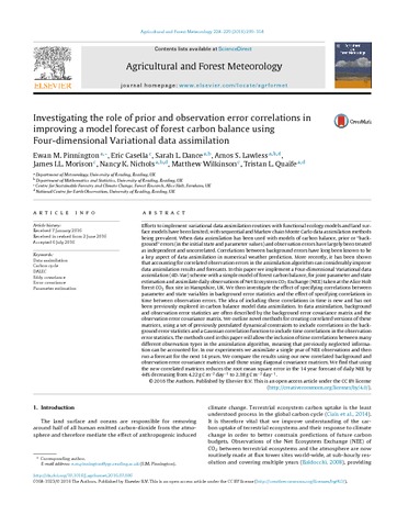 Pinnington, E. M., Casella, E., Dance, S. L. orcid id iconORCID: https://orcid.org/0000-0003-1690-3338, Lawless, A. S. orcid id iconORCID: https://orcid.org/0000-0002-3016-6568, Morison, J. I. L., Nichols, N. K. orcid id iconORCID: https://orcid.org/0000-0003-1133-5220, Wilkinson, M. and Quaife, T. L. orcid id iconORCID: https://orcid.org/0000-0001-6896-4613 (2016) Investigating the role of prior and observation error correlations in improving a model forecast of forest carbon balance using Four Dimensional Variational data assimilation. Agricultural and Forest Meteorology, 228-229. pp. 299-314. ISSN 0168-1923 doi: 10.1016/j.agrformet.2016.07.006