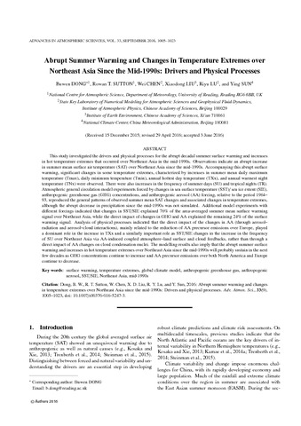 Dong, B. orcid id iconORCID: https://orcid.org/0000-0003-0809-7911, Sutton, R. T. orcid id iconORCID: https://orcid.org/0000-0001-8345-8583, Chen, W., Liu, X., Lu, R. and Sun, Y. (2016) Abrupt summer warming and changes in temperature extremes over Northeast Asia since the mid-1990s: drivers and physical processes. Advances in Atmospheric Sciences, 33 (9). pp. 1005-1023. ISSN 1861-9533 doi: 10.1007/s00376-016-5247-3