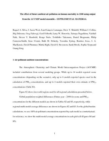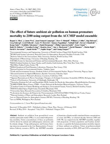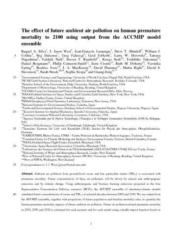 *Silva, R. A., West, J. J., Zhang, Y., Anenberg, S. C., Lamarque, J.-F., Shindell, D. T., Collins, W. J., Dalsoren, S., Faluvegi, G., Folberth, G., Horowitz, L. W., Nagashima, T., Naik, V., Rumbold, S., Skeie, R., Sudo, K., Takemura, T., Bergmann, D., Cameron-Smith, P., Cionni, I., Doherty, R. M., Eyring, V., Josse, B., MacKenzie, I. A., Plummer, D., Righi, M., Stevenson, D. S., Strode, S., Szopa, S. and Zeng, G.: Global premature mortality due to anthropogenic outdoor air pollution and the contribution of past climate change, Environ Res Lett, 8, 034005, doi:10.1088/1748-9326/8/3/034005, 2013.