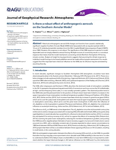 Steptoe, H., Wilcox, L. J. orcid id iconORCID: https://orcid.org/0000-0001-5691-1493 and Highwood, E. J. (2016) Is there a robust effect of anthropogenic aerosols on the Southern Annular Mode? Journal of Geophysical Research: Atmospheres, 121 (17). 10,029-10,042. ISSN 2169-8996 doi: 10.1002/2015JD024218