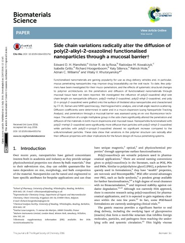 Mansfield, E. D. H., de la Rosa, V. R., Kowalczyk, R. M. orcid id iconORCID: https://orcid.org/0000-0002-3926-6530, Grillo, I., Hoogenboom, R., Sillence, K., Hole, P., Williams, A. C. orcid id iconORCID: https://orcid.org/0000-0003-3654-7916 and Khutoryanskiy, V. V. orcid id iconORCID: https://orcid.org/0000-0002-7221-2630 (2016) Side chain variations radically alter the diffusion of poly(2-alkyl-2-oxazoline) functionalised nanoparticles through a mucosal barrier. Biomaterials Science. ISSN 2047-4830 doi: 10.1039/c6bm00375c