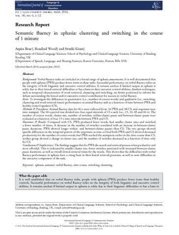 Semantic fluency in aphasia: clustering and switching in the course of one minute.