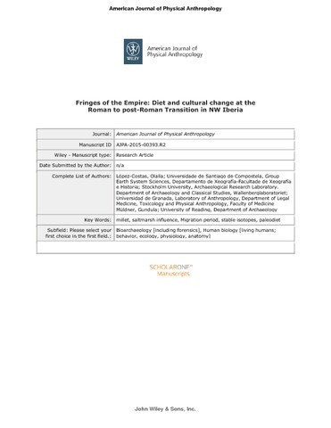 López-Costas, O. and Muldner, G. orcid id iconORCID: https://orcid.org/0000-0002-4513-9263 (2016) Fringes of the empire: diet and cultural change at the Roman to post-Roman transition in NW Iberia. American Journal of Physical Anthropology. ISSN 1096-8644 doi: 10.1002/ajpa.23016