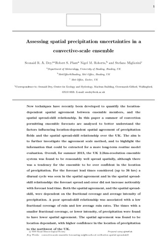 Dey, S. R. A., Plant, R. S. orcid id iconORCID: https://orcid.org/0000-0001-8808-0022, Roberts, N. M. and Migliorini, S. (2016) Assessing spatial precipitation uncertainties in a convective-scale ensemble. Quarterly Journal of the Royal Meteorological Society, 142 (701). pp. 2935-2948. ISSN 1477-870X doi: 10.1002/qj.2893