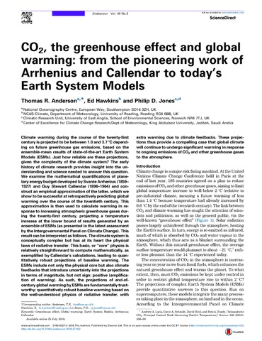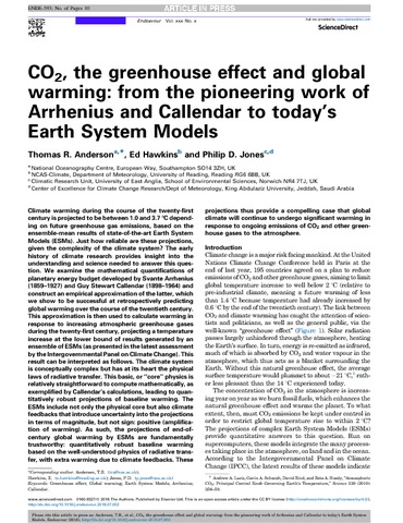 CO2, the greenhouse effect and global warming: from the pioneering work of Arrhenius and Callendar to today's Earth System Models.