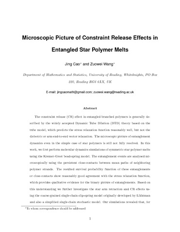 Cao, J. and Wang, Z. (2016) Microscopic picture of constraint release effects in entangled star polymer melts. Macromolecules, 49 (15). pp. 5677-5691. ISSN 1520-5835 doi: 10.1021/acs.macromol.6b00554