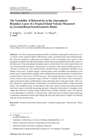 Wadge, G., Costa, A., Pascal, K., Werner, C. and Webb, T. (2016) The variability of refractivity in the atmospheric boundary layer of a tropical island volcano measured by ground-based interferometric radar. Boundary-Layer Meteorology, 161 (2). pp. 309-333. ISSN 0006-8314 doi: 10.1007/s10546-016-0168-3