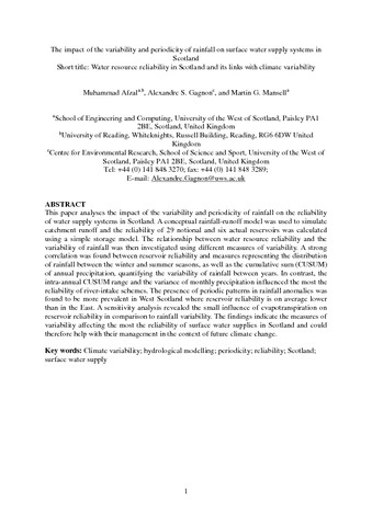 This paper analyses the impact of the variability and periodicity of rainfall on the reliability of water supply systems in Scotland. A conceptual rainfall-runoff model was used to simulate catchment runoff, and the reliability of 29 notional and six actual reservoirs was calculated using a simple storage model. The relationship between water supply reliability and the variability of rainfall was then investigated using different measures of variability. A strong correlation was found between reservoir reliability and measures representing the distribution of rainfall between the winter and summer seasons, as well as the cumulative sum (CUSUM) of annual precipitation, quantifying the variability of rainfall between years. In contrast, mainly the intra-annual CUSUM range and the variance of monthly precipitation influenced the reliability of river-intake schemes. The presence of periodic patterns in rainfall anomalies was found to be more prevalent in West Scotland, where reservoir reliability is on average lower than in the East. In addition, a sensitivity analysis revealed the small influence of evapotranspiration on reservoir reliability in comparison to rainfall variability. This study reveals the measures of variability most affecting the reliability of surface water supplies in Scotland, and could therefore help with their management in the context of future climate change.