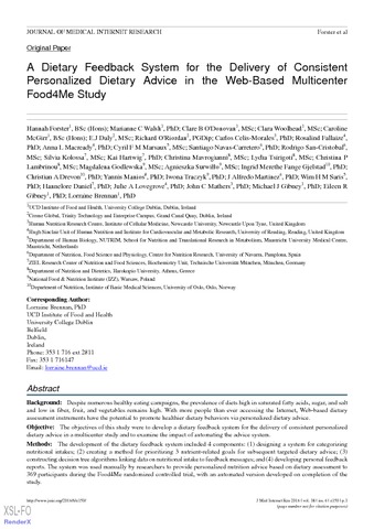 Forster, H., Walsh, M. C., O'Donovan, C. B., Woolhead, C., McGirr, C., Daly, E. J., O'Riordan, R., Celis-Morales, C., Fallaize, R., Macready, A. L. orcid id iconORCID: https://orcid.org/0000-0003-0368-9336, Marsaux, C. F.M., Navas-Carretero, S., San-Cristobal, R., Kolossa, S., Hartwig, K., Mavrogianni, C., Tsirigoti, L., Lambrinou, C. P., Godlewska, M., Surwillo, A., Gjelstad, I. M. F., Drevon, C. A., Manios, Y., Traczyk, I., Martinez, J. A., Saris, W. H. M., Daniel, H., Lovegrove, J. A. orcid id iconORCID: https://orcid.org/0000-0001-7633-9455, Mathers, J. C., Gibney, M. J., Gibney, E. R. and Brenan, L. (2016) A dietary feedback system for the delivery of consistent personalized dietary advice in the web-based multicenter Food4Me study. Journal of Medical Internet Research, 18 (6). e150. ISSN 1438-8871 doi: 10.2196/jmir.5620