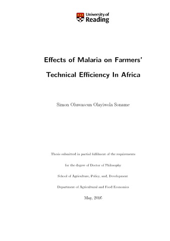 Soname, S. O. O. (2016) Effects of Malaria on farmers’ technical efficiency in Africa. PhD thesis, University of Reading.