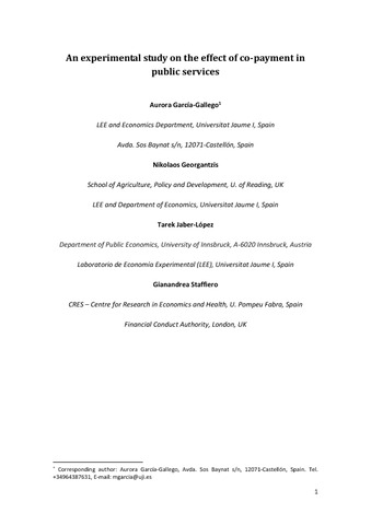 Garcia-Gallego, A., Georgantzis, N., Jaber-Lopez, T. and Stafiero, G. (2016) An experimental study on the effect of co-payment in public services. Journal of Behavioral and Experimental Economics, 65. pp. 109-116. ISSN 2214-8043 doi: 10.1016/j.socec.2016.08.002