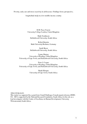 Fearon, R. M. P., Tomlinson, M., Kumsta, R., Skeen, S., Murray, L., Cooper, P. J. and Morgan, B. (2017) Poverty, early care and stress reactivity in adolescence: findings from a prospective, longitudinal study in a low-middle income country. Development and Psychopathology, 29 (2). pp. 449-464. ISSN 1469-2198 doi: 10.1017/S0954579417000104