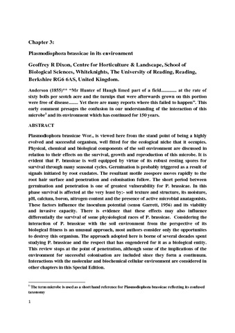 Dixon, G. R. (2009) Plasmodiophora brassiciae in its environment. Journal of Plant Growth Regulation, 28 (3). pp. 212-228. ISSN 0721-7595