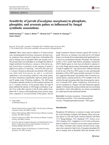 Kariman, K., Barker, S. J., Jost, R., Finnegan, P. M. and Tibbett, M. orcid id iconORCID: https://orcid.org/0000-0003-0143-2190 (2016) Sensitivity of jarrah (Eucalyptus marginata) to phosphate, phosphite, and arsenate pulses as influenced by fungal symbiotic associations. Mycorrhiza, 26 (5). pp. 401-415. ISSN 0940-6360 doi: 10.1007/s00572-015-0674-z
