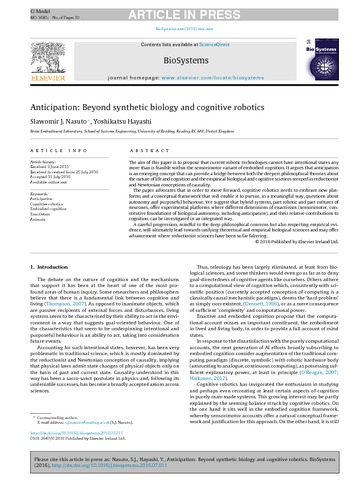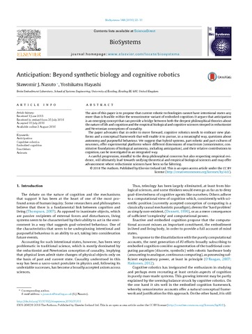 Nasuto, S. J. orcid id iconORCID: https://orcid.org/0000-0001-9414-9049 and Hayashi, Y. orcid id iconORCID: https://orcid.org/0000-0002-9207-6322 (2016) Anticipation: beyond synthetic biology and cognitive robotics. Biosystems, 148. pp. 22-31. ISSN 0303-2647 doi: 10.1016/j.biosystems.2016.07.011