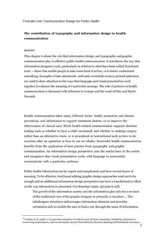This chapter is about the role that information design, and typography and graphic communication play in effective public health communication. It introduces the way that information designers work, particularly in relation to what have been called ‘functional texts’ – those that enable people to take some kind of action, or to better understand something. Examples of late-nineteenth- and early-twentieth-century printed ephemera are used to draw attention to the ways that language and visual presentation work together to enhance the meaning of a particular message. The role of pictures in health communication is discussed with reference to Isotype and the work of Otto and Marie Neurath.