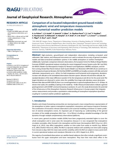 High-resolution, ground-based and independent observations including co-located windradiometer, lidar stations, and infrasound instruments are used to evaluate the accuracy of general circulationmodels and data-constrained assimilation systems in the middle atmosphere at northern hemispheremidlatitudes. Systematic comparisons between observations, the European Centre for Medium-Range WeatherForecasts (ECMWF) operational analyses including the recent Integrated Forecast System cycles 38r1 and 38r2,the NASA’s Modern-Era Retrospective Analysis for Research and Applications (MERRA) reanalyses, and thefree-running climate Max Planck Institute–Earth System Model–Low Resolution (MPI-ESM-LR) are carried out inboth temporal and spectral dom ains. We find that ECMWF and MERRA are broadly consistent with lidar and windradiometer measurements up to ~40 km. For both temperature and horizontal wind components, deviationsincrease with altitude as the assimilated observations become sparser. Between 40 and 60 km altitude, thestandard deviation of the mean difference exceeds 5 K for the temperature and 20 m/s for the zonal wind. Thelargest deviations are observed in winter when the variability from large-scale planetary waves dominates.Between lidar data and MPI-ESM-LR, there is an overall agreement in spectral amplitude down to 15–20 days. Atshorter time scales, the variability is lacking in the model by ~10 dB. Infrasound observations indicate a generalgood agreement with ECWMF wind and temperature products. As such, this study demonstrates the potentialof the infrastructure of the Atmospheric Dynamics Research Infrastructure in Europe project that integratesvarious measurements and provides a quantitative understanding of stratosphere-troposphere dynamicalcoupling for numerical weather prediction applications.
