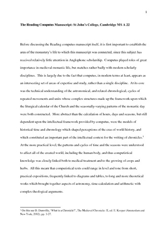 This article provides the first, detailed analysis of the textual contents of this manuscript, and places these findings within the context of monastic life in the Anglo-Norman realm. It argues that the Reading manuscript can be placed within a small group of Anglo-Norman volumes; and examines the intellectual significance of this. Since computus is a subject which is relatively little understood it also discusses the place of the Reading book within the developments in computus at the time.