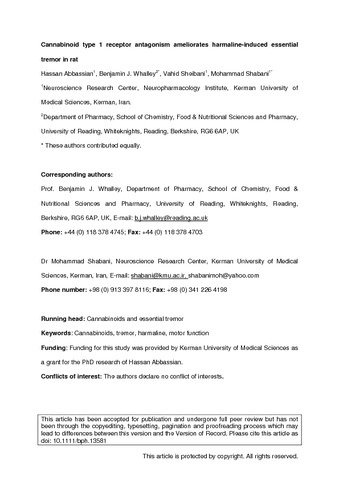 Abbassian, H., Whalley, B. J., Sheibani, V. and Shabani, M. (2016) Cannabinoid type 1 receptor antagonism ameliorates harmaline-induced essential tremor in rat. British Journal of Pharmacology, 173 (22). pp. 3196-3207. ISSN 1476-5381 doi: 10.1111/bph.13581