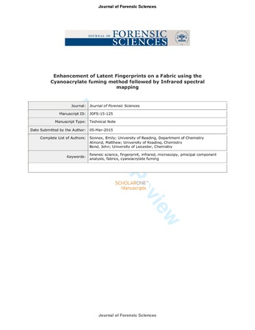 Sonnex, E., Almond, M. J. and Bond, J. W. (2016) Enhancement of latent fingerprints on fabric using the cyanoacrylate fuming method followed by infrared spectral mapping. Journal of Forensic Sciences, 61 (4). pp. 1100-1106. ISSN 0022-1198 doi: 10.1111/1556-4029.13065