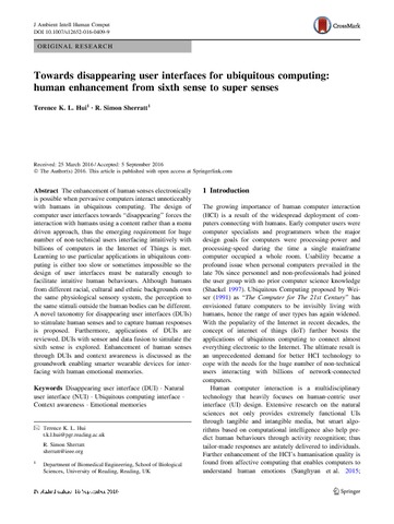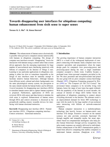 Hui, T. K. L. and Sherratt, R. S. orcid id iconORCID: https://orcid.org/0000-0001-7899-4445 (2017) Towards disappearing user interfaces for ubiquitous computing: human enhancement from sixth sense to super senses. Journal of Ambient Intelligence and Humanized Computing, 8 (3). pp. 449-465. ISSN 1868-5145 doi: 10.1007/s12652-016-0409-9