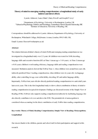 Atkinson, L., Slade, L., Powell, D. orcid id iconORCID: https://orcid.org/0000-0002-3607-2407 and Levy, J. P. (2017) Theory of mind in emerging reading comprehension: a longitudinal study of early indirect and direct effects. Journal of Experimental Child Psychology, 164. pp. 225-238. ISSN 0022-0965 doi: 10.1016/j.jecp.2017.04.007