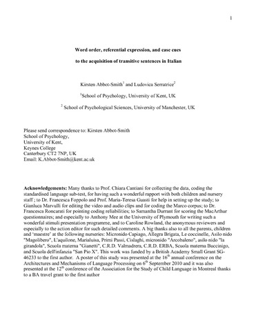 Abbot-Smith, K. and Serratrice, L. orcid id iconORCID: https://orcid.org/0000-0001-5141-6186 (2015) Word order, referential expression, and case cues to the acquisition of transitive sentences in Italian. Journal of Child Language, 42 (1). pp. 1-31. ISSN 0305-0009 doi: 10.1017/S0305000913000421