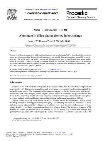 Hinman, N. W. and Kotler, J. M. (2013) Aluminum in silica phases formed in hot springs. Procedia Earth and Planetary Science, 7. pp. 365-368. ISSN 1878-5220 doi: 10.1016/j.proeps.2013.03.078