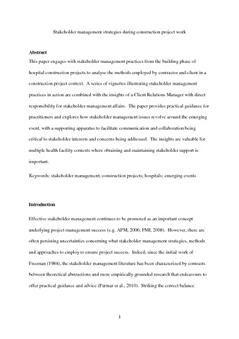 This paper engages with stakeholder management practices from the building phase of hospital construction projects to analyse the methods employed by contractor and client in a construction project context. A series of vignettes illustrating stakeholder management practices in action are combined with the insights of a Client Relations Manager with direct responsibility for stakeholder management affairs. The paper provides practical guidance for practitioners and explores how stakeholder management issues revolve around the emerging event, with a supporting apparatus to facilitate communication and collaboration being critical to stakeholder interests and concerns being addressed. The insights are valuable for multiple health facility contexts where obtaining and maintaining stakeholder support is important.