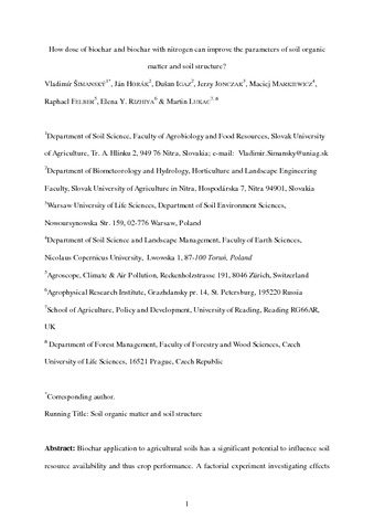 Simansky, V., Horak, J., Igaz, D., Jonczak, J., Markiewicz, M., Felber, R., Rizhiya, E. Y. and Lukac, M. orcid id iconORCID: https://orcid.org/0000-0002-8535-6334 (2016) How dose of biochar and biochar with nitrogen can improve the parameters of soil organic matter and soil structure? Biologia, 71 (9). pp. 989-995. ISSN 0006-3088 doi: 10.1515/biolog-2016-0122
