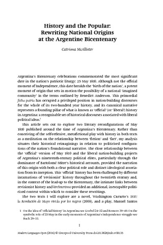 This article explores two texts that offer a self-conscious, metafictional rewriting of Argentina’s founding revolution in May 1810 at the time of the nation’s Bicentenary. It aims to draw out the political focus of both texts (a novel by Washington Cucurto and a play by Manuel Santos Iñurrieta) by analysing the ways in which they draw on heavily politicized historical discourses in their fictional appropriations of this moment of origin. This analysis leads to the emergence of two very different ideas of the popular in both works, one closely related to Peronist discourse and the other entwined with the Marxist concept of the proletariat. This article therefore argues for the need to reconsider the definitions of the relationship between literature and history that emerge from postmodernist theory, definitions which centre on the epistemological relationship between ‘fiction’ and ‘fact’. Instead, it proposes a foregrounding of public discourses of history, often employed as political tools, in order to perceive a far more detailed engagement with the political in literary texts that rewrite history.