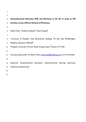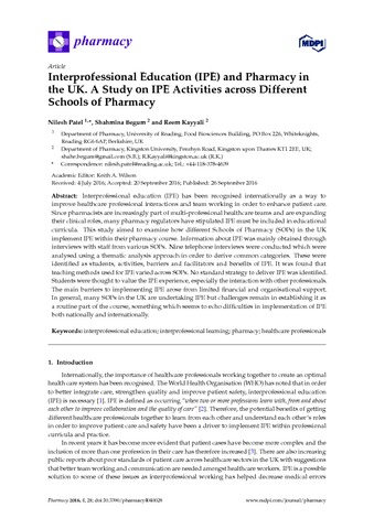 Patel, N. orcid id iconORCID: https://orcid.org/0000-0002-8600-0663, Begum, S. and Kayyali, R. (2016) Interprofessional Education (IPE) and Pharmacy in the UK: a study on IPE activities across different Schools of Pharmacy. Pharmacy, 4 (4). 28. ISSN 2226-4787 doi: 10.3390/pharmacy4040028