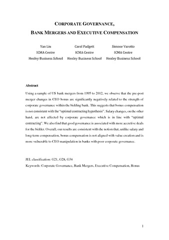 Using a sample of US bank mergers from 1995 to 2012, we observe that the pre-post merger changes in CEO bonus are significantly negatively related to the strength of corporate governance within the bidding bank. This suggests that bonus compensation is not consistent with the “optimal contracting hypothesis”. Salary changes, on the other hand, are not affected by corporate governance which is in line with “optimal contracting”. We also find that good governance is associated with more accretive deals for the bidder. Overall, our results are consistent with the notion that, unlike salary and long-term compensation, bonus compensation is not aligned with value creation and is more vulnerable to CEO manipulation in banks with poor corporate governance.