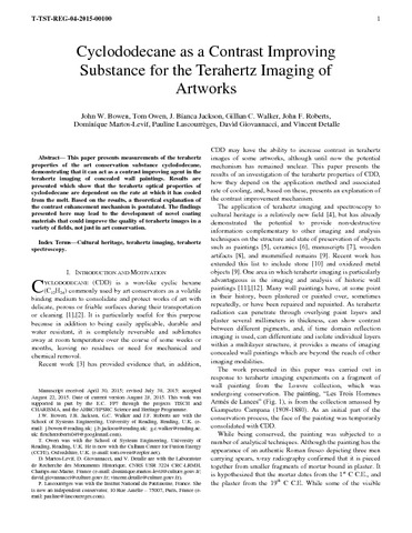 Bowen, J. W., Owen, T., Jackson, J. B., Walker, G. C., Roberts, J. F., Martos-Levif, D., Lascourrèges, P., Giovannacci, D. and Detalle, V. (2015) Cyclododecane as a contrast improving substance for the terahertz imaging of artworks. IEEE Transactions on Terahertz Science and Technology, 5 (6). pp. 1005-1011. ISSN 2156-342X doi: 10.1109/TTHZ.2015.2476666