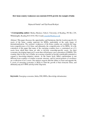 This paper discusses the opportunities and limitations that the location-specific (L) assets of the home country represent for MNEs, particularly at the early stages of internationalization. The systemic weaknesses of the home country can constrain the long-term competitiveness of its firms, and ultimately, the competitiveness of its MNEs. It is the contention of this paper that many of the emerging countries have a constrained set of L assets from which their firms are able to develop ownership-specific assets. Are their economies developing improved L assets that will promote a new generation of EMNEs? We examine data for the case of India, an economy regarded as having considerable potential to expand to knowledge-intensive sectors. At the macro level, India’s performance is not different from countries of similar economic structure, and its current pockets of excellence are a reflection of its L assets. Our analysis suggests that the failure to foster and upgrade the L assets of emerging economies is likely to stunt the growth of their domestic firms, and ultimately any new MNE activity in the long-term.