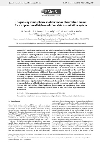 Cordoba, M., Dance, S. L. orcid id iconORCID: https://orcid.org/0000-0003-1690-3338, Kelly, G. A., Nichols, N. K. orcid id iconORCID: https://orcid.org/0000-0003-1133-5220 and Waller, J. A. (2017) Diagnosing atmospheric motion vector observation errors for an operational high resolution data assimilation system. Quarterly Journal of the Royal Meteorological Society, 143 (702). pp. 333-341. ISSN 1477-870X doi: 10.1002/qj.2925
