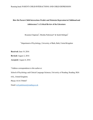 Chapman, R., Parkinson, M. and Halligan, S. (2016) How do parent-child interactions predict and maintain depression in childhood and adolescence? A critical review of the literature. Adolescent Psychiatry, 6 (2). pp. 100-115. ISSN 2210-6766 doi: 10.2174/2210676606666160822101450