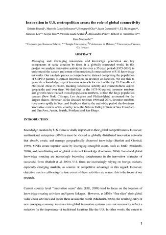 Brandl, K., Kollmann, M. C., Cha, H., Darendeli, I., Hannigan, T.J., Lee, A., Kim, S., Giada Scalera, V., Perri, A., Hamilton, R. D. and Mudambi, R. (2015) Innovation in US metroploitan areas: the role of global connectivity. In: Belussi, F. and Orsi, L. (eds.) Innovation, alliances, and networks in high-tech environments. Routledge, Abingdon. ISBN 9781138846609