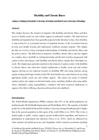 Ottosdottir, G. and Evans, R. orcid id iconORCID: https://orcid.org/0000-0002-4599-5270 (2016) Disability and chronic illness. In: Thomas, F. (ed.) Handbook of Migration and Health. Edward Elgar. ISBN 9781784714772 doi: 10.4337/9781784714789