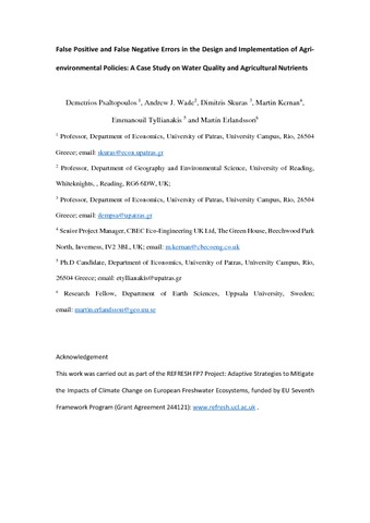 Psaltopoulos, D., Wade, A. orcid id iconORCID: https://orcid.org/0000-0002-5296-8350, Skuras, D., Kernan, M., Tyllianakis, E. and Erlandsson, M. (2017) False positive and false negative errors in the design and implementation of agri-environmental policies: a case study on water quality and agricultural nutrients. Science of the Total Environment, 575. pp. 1087-1099. ISSN 0048-9697 doi: 10.1016/j.scitotenv.2016.09.181