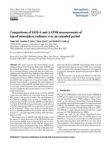 Bali, M., Mittaz, J. P., Maturi, E. and Goldberg, M. D. (2016) Comparisons of IASI-A and AATSR measurements of top-of-atmosphere radiance over an extended period. Atmospheric Measurement Techniques, 9 (7). pp. 3325-3336. ISSN 1867-8548 doi: 10.5194/amt-9-3325-2016