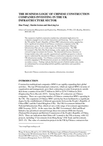 The expansion of global construction markets has substantial implications for companies engaged in cross-border transactions and financing. The convergence of the UK and the People’s Republic of China (PRC) infrastructure policy agendas has led to significant investment from Chinese construction companies in the UK infrastructure sector. On the demand side, the UK Government’s National Infrastructure Plan sets out a wide range of investment priorities. The PRC Government’s One Belt, One Road strategy, on the supply side, has prioritized outward foreign investment into Eurasia. The international business literature on foreign market entry with a specific organizational capability perspective is drawn upon to understand the rationale for Chinese construction companies to invest in the UK infrastructure market. Two Chinese construction multinational companies currently engaging in UK infrastructure projects are studied through interpreting secondary sources. Findings indicate that their pursuit of hybrid market entry modes are underpinned by corresponding hybrid capability exploitation and acquisition motivations.