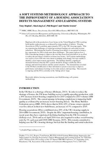 Rapid growth in the production of new homes in the United Kingdom (UK) is putting build quality under pressure as evidenced by rising numbers of defects. Housing Associations (HAs) contribute approximately 20% to the UK’s housing supply. HAs are experiencing challenges of central government funding cuts and rental revenue reductions. Maximising the benefit of learning from defects is recognised as being a key opportunity for HAs to help meet these challenges. This paper explores how a HA is introducing change to improve the way they learn from past defects in an effort to reduce the prevalence of defects in future new homes. Soft systems methodology was used to assist a HA who were intent on making such change, but were unable to identify a clear improvement opportunity. The findings identify a significant mismatch between what the HA’s system should be doing to enable the HA to manage and learn from defects and the current situation. The mismatch has revealed to the HA that a modification to their information system is necessary to improve performance and enhance learning via live data analysis and reporting. This research is ongoing and the HA is currently in the ‘taking action’ stage.